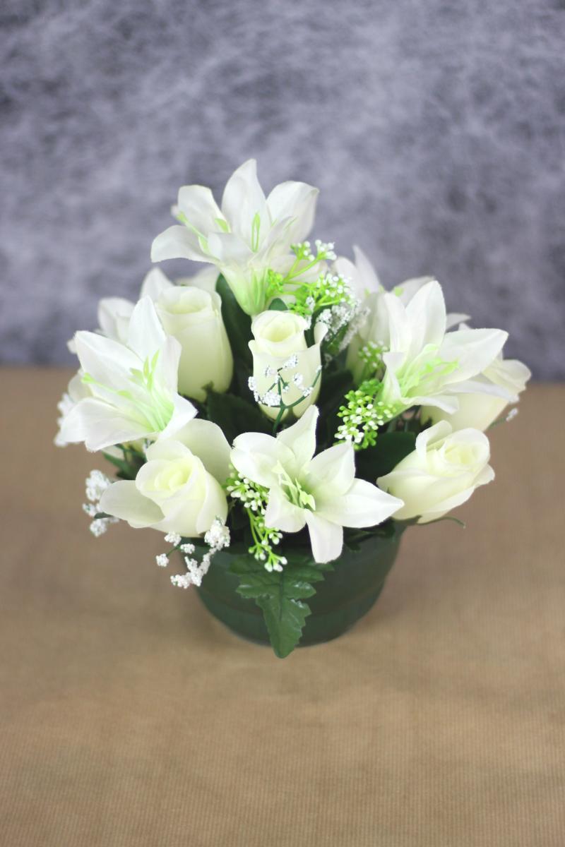 Fleurs artificielles pour cimetière - Coupe de roses, lys et gypso
