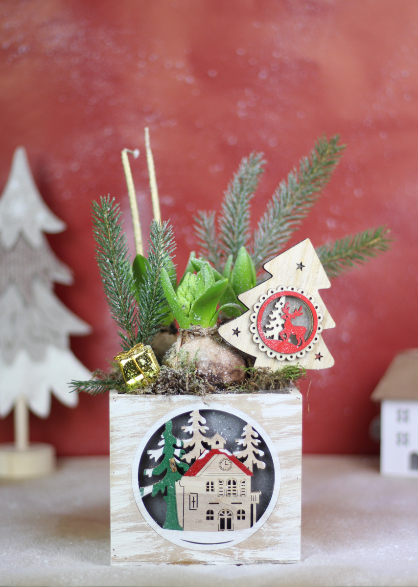 Cette composition a été pensée spécialement pour les fêtes de fin d'année. Elle se compose de sapin frais, jacinthes et pic décoratif. C'est la composition idéale pour décorer votre maison pour Noël, vous pourrez par ailleurs conserver la plupart des éléments décoratifs une fois les jacinthes fanées.